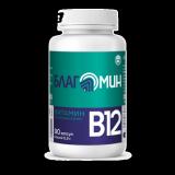 БЛАГОМИН В12 – дополнительный источник витамина В12 (цианокобаламина). В 1 капсуле БЛАГОМИН В12 содержится 9 мкг цианокобаламина, что составляет 900% от рекомендуемого уровня суточного потребления (не превышает верхний допустимый уровень потребления). Разрешен к применению с 14 лет. Одной упаковки 90 капсул достаточно для 3 курсов применения.
