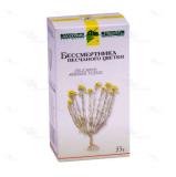 Корзинки шаровидные одиночные, мелкие, иногда по 2-3 вместе, отдельные цветоложа и их кусочки с остатками листочков обвертки, отдельные листочки обвертки и трубчатые цветки, кусочки стеблей и цветоносов, плоды. Цвет лимонно-желтый с оранжевыми, серовато-коричневыми, зеленовато-серыми, редко темно-коричневыми вкраплениями. Запах слабый, ароматный. Вкус водного извлечения пряно-горький. Цветки бессмертника содержат флавоноиды, дубильные вещества, эфирное масло, смолы, филлохиноны, органические кислоты, каротиноиды, полисахариды и другие биологически активные вещества.Действие