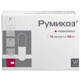 Препараты, уменьшающие кислотность желудочного сока снижают абсорбцию итраконазола. Лекарственные средства, оказывающие влияние на метаболизм итраконазола. Итраконазол в основном расщепляется ферментом CYP3A4. При одновременном применении с рифампицином, рифабутином, фенитоином, карбамазепином, изониазидом, являющимися мощными индукторами фермента CYP3A4, биодоступность итраконазола и гидрокси-итраконазола значительно снижается, что приводит к существенному уменьшению эффективности препарата. Одновременное применение Румикоза® с данными препаратами, являющимися потенциальными индукторами печеночных ферментов, не рекомендуется. Мощные ингибиторы фермента CYP3A4, такие как ритонавир, индинавир, кларитромицин и эритромицин, могут увеличивать биодоступность итраконазола. Влияние итраконазола на метаболизм других лекарственных средств: Итраконазол может ингибировать метаболизм препаратов, расщепляемых ферментом CYP3A4. Результатом этого может быть усиление или пролонгация их действия, в том числе и побочных эффектов. После прекращения лечения препаратом Румикоз®, концентрация итраконазола в плазме снижается постепенно в зависимости от дозы и длительности лечения (см. раздел Фармакокинетика). Это необходимо принимать во внимание при обсуждении ингибирующего эффекта итраконазола на сопутствующие лекарственные средства. Примерами таких лекарств являются: Лекарственные средства, назначать которые одновременно с препаратом Румикоз® не рекомендуется: •блокаторы кальциевых каналов - в дополнение к возможному фармакокинетическому взаимодействию, связанному с общим путем метаболизма с участием фермента CYP3A4, блокаторы кальциевых каналов могут оказывать отрицательный инотропный эффект, который усиливается при одновременном приеме с препаратом Румикоз®. Препараты, при одновременном назначении которых рекомендуется следить за их концентрацией в плазме, действием, побочными эффектами. При необходимости дозу этих препаратов следует уменьшить. •пероральные антикоагулянты; •ингибиторы ВИЧ-протеазы (ритонавир, индинавир, саквинавир); •некоторые противоопухолевые препараты (алкалоиды барвинка розового, бусульфан, доцетаксел, триметрексат); •расщепляемые ферментом CYP3A4 блокаторы кальциевых каналов (верапамил и производные дигидропиридина); •некоторые иммуносупрессивные средства (циклоспорин, такролимус, сиролимус (также известный как рапамицин); •некоторые расщепляемые ферментом CYP3A4 ингибиторы редуктазы ГМГ- КоА (аторвастатин); •некоторые глюкокортикостероиды (будесонид, дексаметазон и метилпреднизолон); •другие препараты: дигоксин, карбамазепин, буспирон, алфентанил, алпразолам, бротизолам, мидазолам для внутривенного введения, рифабутин, эбастин, ребоксетин, цилостазол, дизопирамид, элетриптан, галофантрин, репаглинид. Взаимодействия между итраконазолом зидовудином и флувастатином не обнаружено. Не отмечалось влияния итраконазола на метаболизм этинилэстрадиола и норэтистерона. Исследования in vitro продемонстрировали отсутствие взаимодействия между итраконазолом и такими лекарственными средствами, как имипрамин, пропранолол, диазепам, циметидин, индометацин, толбутамид и сульфамеразин при связывании с белками плазмы.Способ применения и дозы