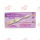 ХГЧ-тест Чек4 (1000) (Check4-hCG (hl) представляет собой тест-кассету из пластикового (полистиролового) корпуса с двумя ячейками, в который заключена реакционная пластина из нитроцеллюлозы, две части которой имеют различную чувствительность к ХГЧ. На конце корпуса имеется съемный колпачок, под которым находится поглощающий наконечник для нанесения образца мочи.